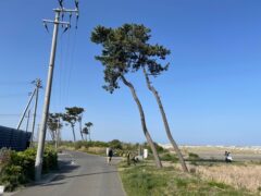 海岸へ行ってみると津波で斜めになってしまった数本の松の木が残っていました。