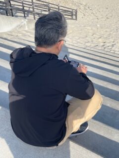 伊原社長は海岸で腰を掛け、携帯で荒浜の位置・地形等を確認しながら